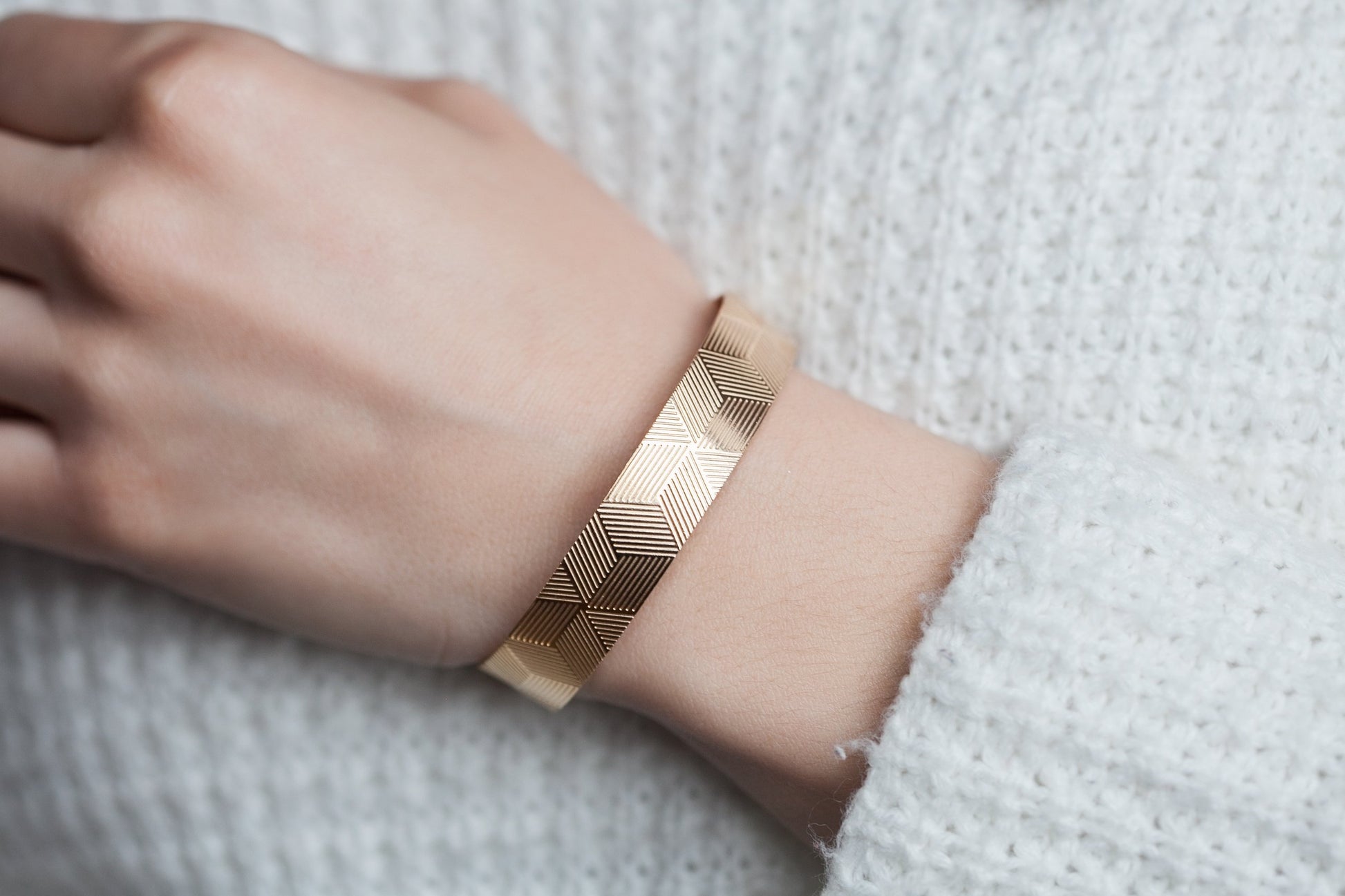 Très joli bracelet manchette jonc plaqué or avec motifs Art Déco.