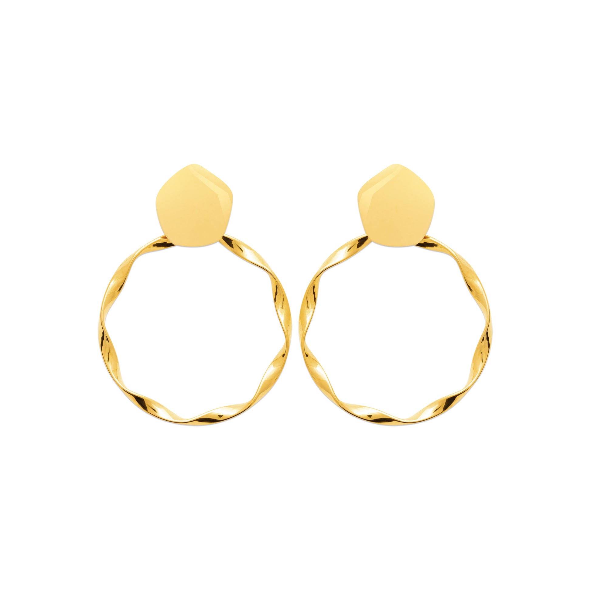Ces boucles d’oreilles dorées arborent un design moderne et sculptural : un anneau légèrement torsadé suspendu à un clou géométrique poli. Leur forme fluide et leur brillance dorée captent la lumière à chaque mouvement, apportant une élégance raffinée et contemporaine à votre style.