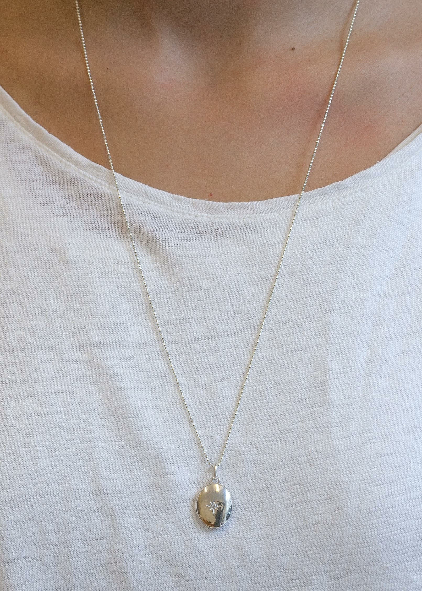 Très joli collier sautoir avec pendentif médaillon gravé d'une étoile du nord et serti d'un strass.